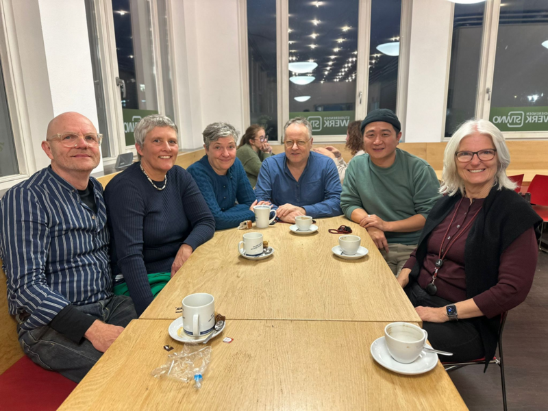 Foto 2: Von links: Olaf Tischmann im Austausch mit Dozierenden und Mitarbeitenden Ulrike Walter, Prof. Dr. Sabine Fries, Prof. Dr. Jens Heßmann, Dawei Ni, Margit Hillenmeyer des Studiengangs Gebärdensprachdolmetschen.