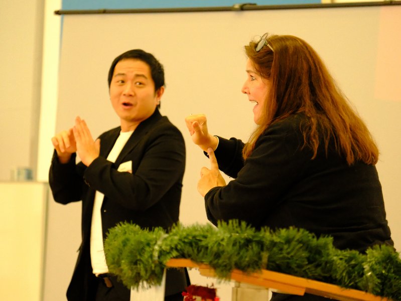 Foto 1: Ein fachlicher Höhepunkt der Jubiläumsfeier war der Beitrag von Prof. Dr. Gabrielle Jones von der University of California San Diego (rechts) in Amerikanischer Gebärdensprache, simultan von Dawei Ni (links) in Deutsche Gebärdensprache sowie von Gebärdensprachdolmetschern in Lautsprache gedolmetscht.