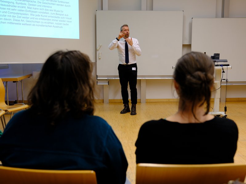 Ein fachlicher Höhepunkt des Vormittags war der Beitrag von Prof. Dr. Gabrielle Jones von der University of California San Diego. Ihr Vortrag in Amerikanischer Gebärdensprache, simultan in Deutsche Gebärdensprache und Lautsprache gedolmetscht, machte nicht nur die internationale Vernetzung des Studiengangs sichtbar, sondern betonte auch die Selbstverständlichkeit mehrsprachiger, multimodaler Wissenschaftskommunikation im Feld der Deaf Studies und des Dolmetschens.