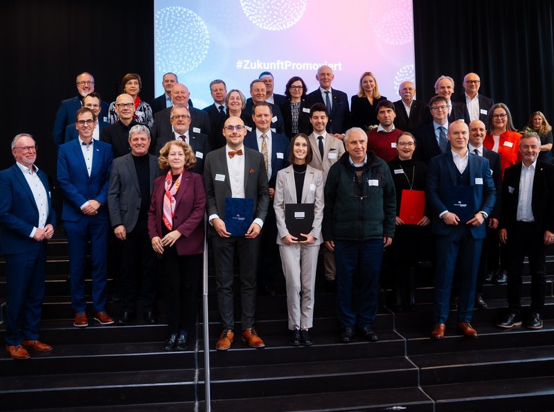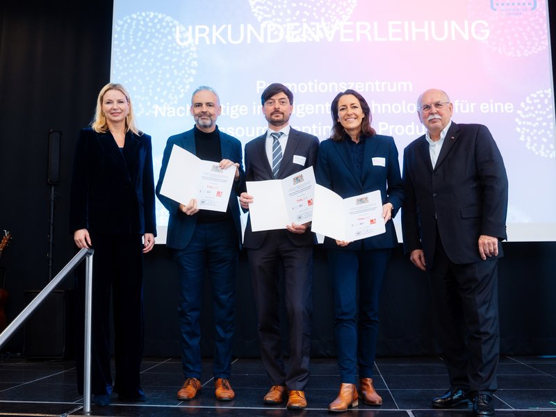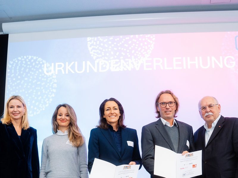 Die Hochschule Landshut vertraten aus der Hochschulleitung Prof. Dr. Michaela Wirtz, Präsidentin, und Prof. Dr. Aida Anetsberger, Vizepräsidentin Forschung und wissenschaftlicher Nachwuchs. Zusätzlich waren Prof. Dr. Alexander Kleimaier (Vertreter im Steuerungskreis NITRO), Luisa Grameier und Bernhard Jahn (beide Promovierendenvertretung NITRO) sowie Dr. Linda Klingler (Referentin Landshut Graduate Center) anwesend. Aida Anetsberger nahm die Ehrungen für DigiTech und DIWAG stellvertretend in Empfang, zusammen mit den Vizepräsidenten und wissenschaftlichen Leitungen unserer Partnerhochschulen Neu-Ulm, Amberg-Weiden, Deggendorf und Augsburg. Alexander Kleimaier nahm die Ehrung für NITRO entgegen, zusammen mit der Vizepräsidentin und dem Vizepräsidenten aus Augsburg und Deggendorf.