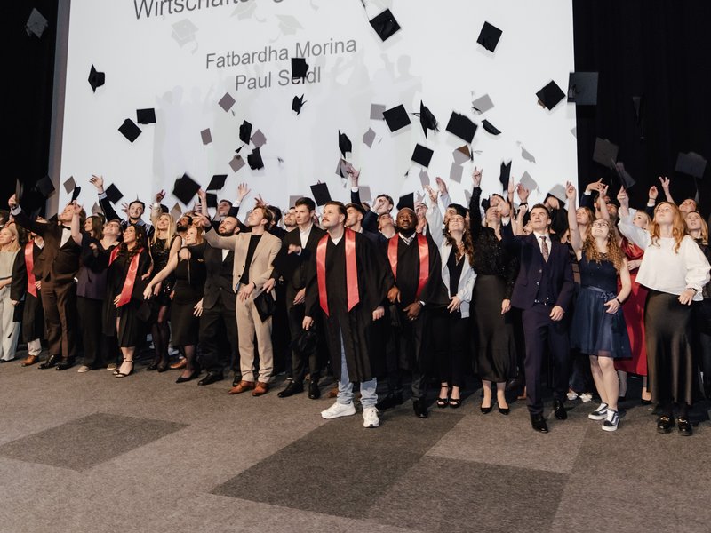 Besonders emotional wurde es, als die Absolventinnen und Absolventen ihre Hüte hoch in Luft warfen. Ein symbolischer Akt, der das Ende eines Kapitels im Leben markiert, vor allem aber die Aufbruchstimmung und die Freude auf das, was die Zukunft bringt. Das unvergessliche Bild wurde von langanhaltendem Applaus begleitet. Nach dem zentralen Festakt feierten viele der Absolventinnen und Absolventen ihren Erfolg auf der von den studentischen Vereinen organisierten Abschlussparty an der Hochschule. Lehrkräfte und Professoren sorgten als DJs bis in den Morgen hinein für ausgelassene Stimmung. Die Absolventinnen und Absolventen konnten ein letztes Mal an der Hochschule gemeinsam mit ihren Freundinnen und Freunden den Dancefloor rocken.
