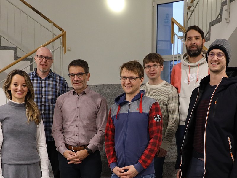 Foto 1: Bei dem Besuch konnten sich Forschende, Promovierende und Studierende über die Möglichkeiten des Supercomputers informieren (v. l. n. r.): Prof. Dr. Aida Anetsberger, Prof. Dr. Eduard Kromer, Prof. Dr. Gerhard Wellein, Direktor des Zentrums für Nationales Hochleistungsrechnen Erlangen (NHR@FAU), Prof. Dr. Christian Osendorfer, Benjamin Geissler, Scientific Researcher im Bereich Big Data & AI am Leibniz-Rechenzentrum, Prof. Dr. Alexander Wallis, Ulrich Ludolfinger