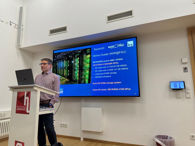 Um die Möglichkeiten des Supercomputers vorzustellen, besuchte Prof. Dr. Gerhard Wellein am 16. Dezember 2025 die Hochschule Landshut. Wellein ist Professor für High Performance Computing und Direktor des Zentrums für Nationales Hochleistungsrechnen Erlangen (NHR@FAU) an der Friedrich-Alexander-Universität Erlangen-Nürnberg. Er koordiniert als Mitglied des Vorstands der NHR-Allianz die nationale High-Performance Computing-Infrastruktur an deutschen Universitäten und bringt über zwanzig Jahre Erfahrung in der Vermittlung von Hochleistungsrechentechniken mit. Begleitet wurde er von Benjamin Geissler, Scientific Researcher im Bereich Big Data & AI am Leibniz-Rechenzentrum (LRZ).