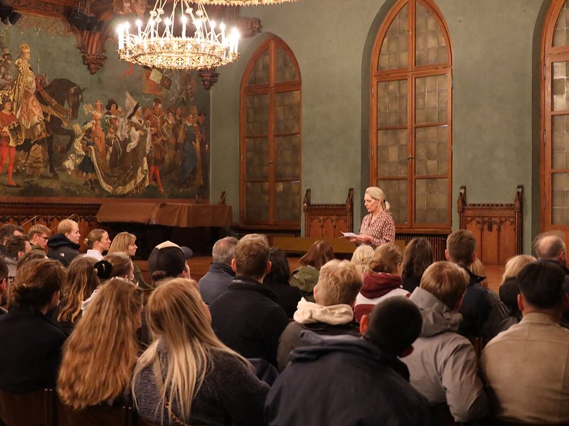Bild 1: Die begeisterten Teilnehmenden mit Stadträtin Patrizia Steinberger im Prunksaal des Rathauses der Stadt Landshut.