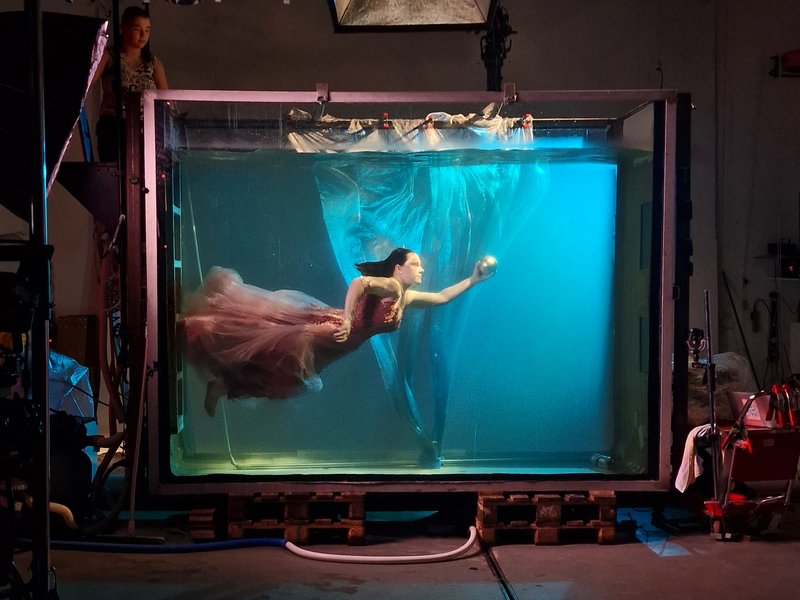 Für 16 Studierende führte das Seminar in das Indigo-Studio nach Heidelberg, wo ein großes gläsernes Aquarium als professionelle Kulisse diente. Mit Moodboards und kreativen Konzepten ausgestattet, arbeiteten die Studierenden sowohl vor als auch hinter der Kamera: Während einige in die Rolle der Modelle schlüpften, übernahmen andere Assistenz, Technik oder künstlerische Leitung. „Unter Wasser verändert sich alles, vom Licht bis hin zu den Bewegungen – und damit die Art, wie Geschichten entstehen. Genau das nutzen wir als künstlerisches Experimentierfeld“, erklärt Studiengangsleitung Jerrentrup.