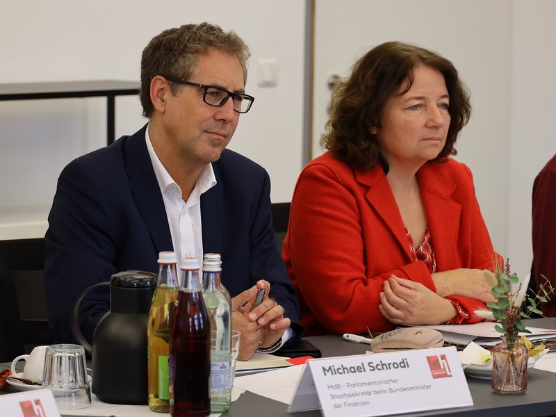 Bild 3: Der Parlamentarische Staatssekretär beim Bundesminister der Finanzen, Michael Schrodi und die SPD-Landtagsabgeordnete Ruth Müller während eines Vortrags.