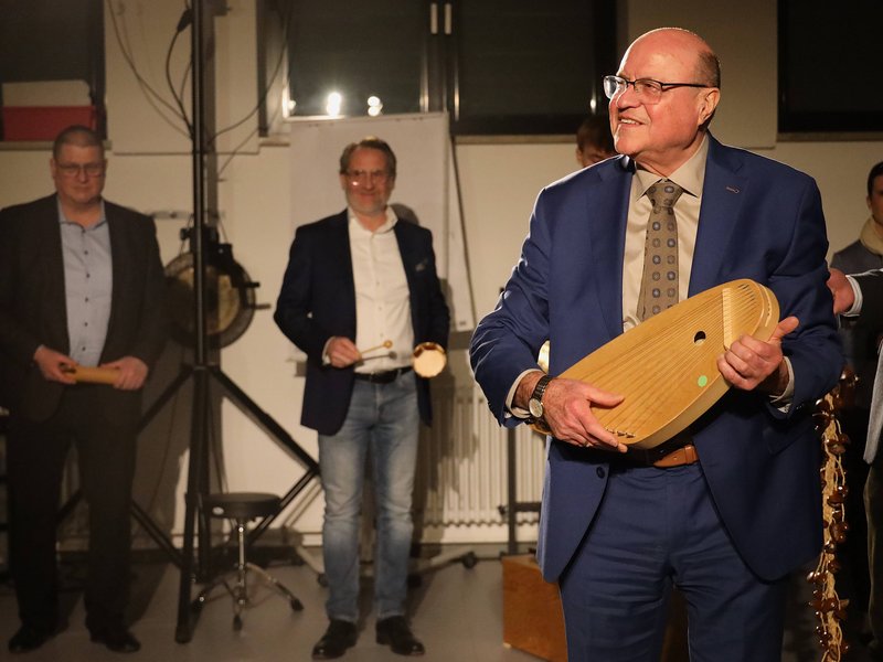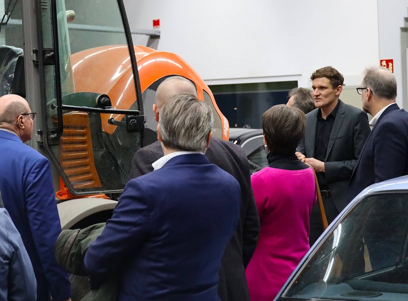Die Gäste bekamen anschließend die Chance, zwei der Labore live zu erleben. Im Musiklabor komponierten die Teilnehmerinnen und Teilnehmer unter der Anleitung von Prof. Bruno Franceschini nach ersten vorsichtigen Versuchen mit außergewöhnlichen Instrumenten eine kleine Symphonie. Das Besondere dabei: Dies gelang ohne Absprache und verbaler Kommunikation. Prof. Dr. Mathias Wagensoner stellt das „Labor für Nutzfahrzeugtechnik“ vor. Er ging dabei unter anderem auf die Marktchancen emissionsfreier Antriebsformen von Batterietechnologie über eFuels bis zu Wasserstoff ein. In der Fahrzeughalle hatten die Gäste die Möglichkeit, Maschinen aus Forschungsprojekten der Hochschule Landshut, etwa zu batterieelektrischen Baumaschinen in Kooperation mit der TU München, aus nächster Nähe zu betrachten.