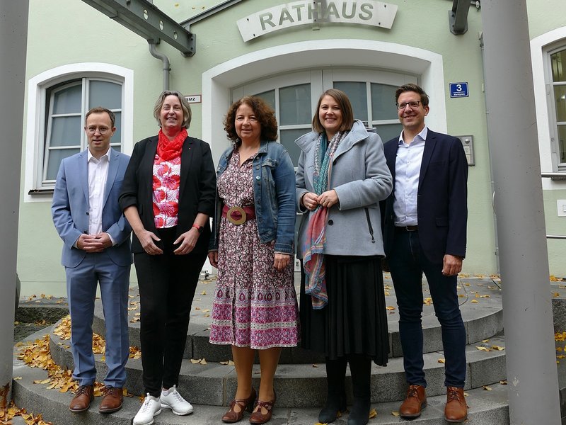 Foto 1: Von Links.: Bürgermeister Florian Hölzl, Hochschulpräsidentin Prof. Dr. Michaela Wirtz, Landtagsabgeordnete Ruth Müller, Bundestagsabgeordnete Carolin Wagner und Vize-Hochschulpräsident Prof. Dr. Stefan Bormann vor dem Rathaus Pfeffenhausen