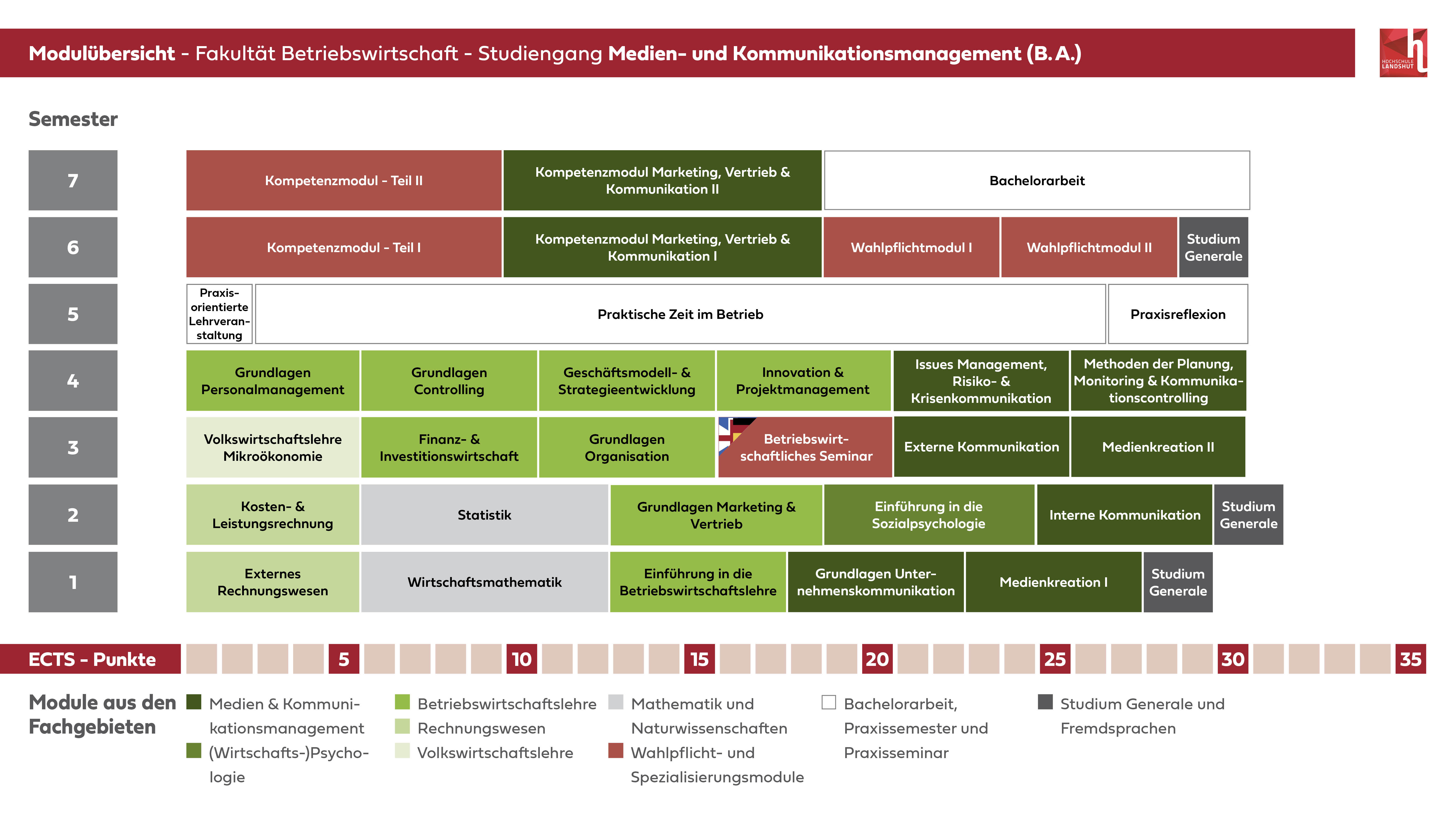 The degree programme comprises six theoretical semesters and one practical semester. In the first two semesters, students learn the basics of business administration and corporate communication. In the following year, students deal with business management functions and external communication and acquire the relevant skills. In the fifth semester, they complete an internship in a company of their choice, accompanied by lectures and reflections. In the final year of study, they specialise in marketing and sales management and choose a further specialisation such as organisational concepts/ personnel management. The Bachelor's thesis concludes the programme.