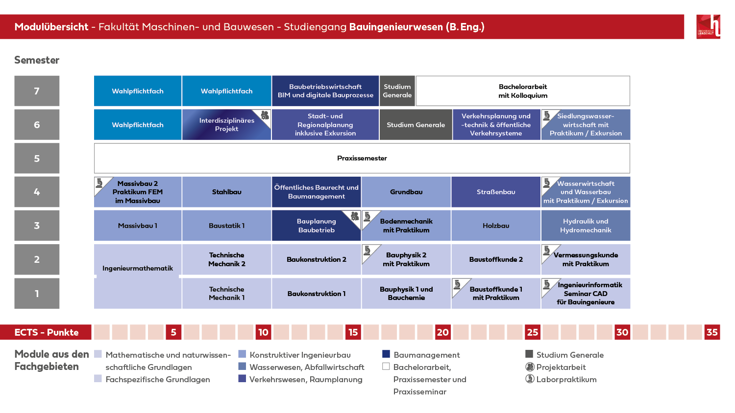 The degree programme extends over seven semesters, including an internship semester in the fifth semester. The first semesters mainly cover the basics of civil engineering, such as mathematics, mechanics, structural design and building materials science, which are then expanded in the following semesters to include the technical basics of the main fields of civil engineering, such as hydraulic engineering, traffic route construction, construction management, solid construction, steel construction and timber construction. Exercises, internships and excursions are offered on an ongoing basis to strengthen the practical relevance of the programme. Practical training, an integral part of the degree programme, takes place in construction companies, engineering offices and construction administration, accompanied by practice-oriented courses.