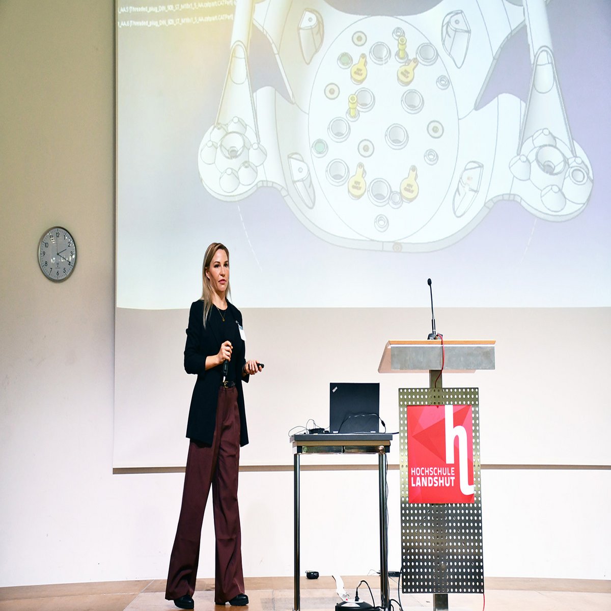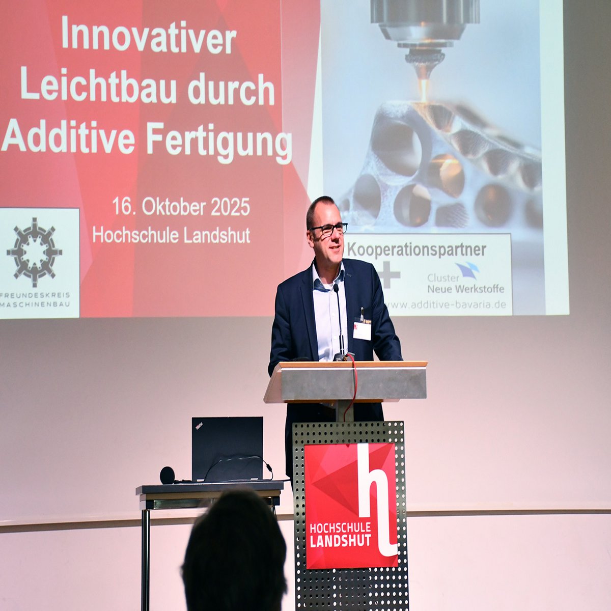 Die Additive Fertigung (AF) bedeutet für den Leichtbau und damit für die Industrie einen enormen Innovationsschub, betonte Veranstaltungsinitiator Prof. Dr. Norbert Babel in seiner Themeneinführung. Und der Leichtbau habe an der Hochschule Landshut mit dem Kompetenzzentrum Leichtbau und dem Leichtbau-Cluster lange Tradition. Grund genug, dieses Thema beim mittlerweile 12. Praxisforum der Hochschule Landshut am 12. Oktober 2025 in den Mittelpunkt zu stellen. Dabei trafen sich nicht nur rund 50 Experten/-innen aus Wissenschaft und Industrie im Kontext des 3D-Drucks, zusätzlich nutzten rund 60 Studierende die Gelegenheit zum Austausch und um sich über aktuelle Erkenntnisse und Praxisbeispiele zu informieren, wie sich der Vizepräsident der Hochschule Landshut, Prof. Dr. Marcus Jautze, in seiner Begrüßung freute.