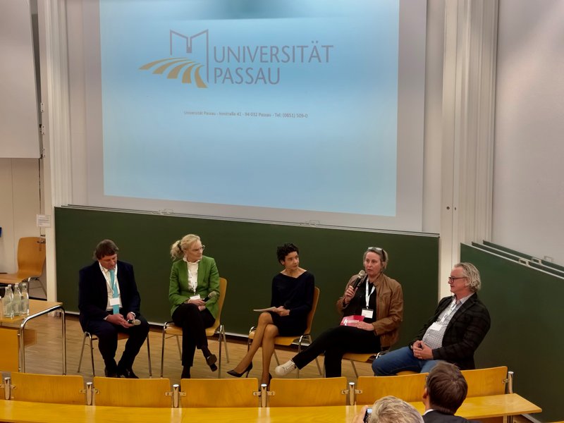 Foto 3: Hochschulpräsidentin Prof. Dr. Michaela Wirtz (Zweite v.r.) diskutiert gemeinsam mit Dr. Alexander Wisspeintner (MicroEpsilon Messtechnik GmbH & Co.KG), Dr. Jutta Krogull (Vereinigung der Bayerischen Wirtschaft e.V.), Moderatorin Katrina Jordan (Leiterin der Abteilung Kommunikation und Marketing an der Universität Passau) sowie Dr. Ulrich Cimolino (Selbstständiger Berater).