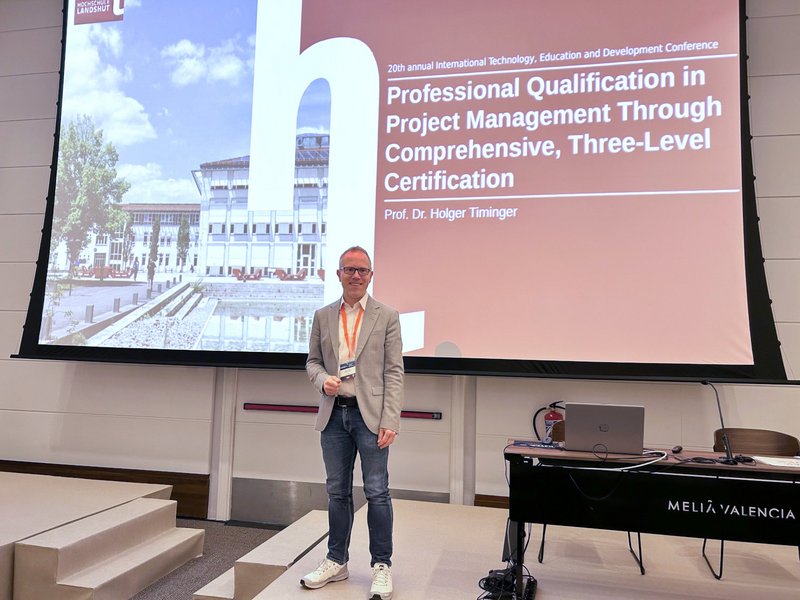 Prof. Dr. Holger Timinger stellte in diesem Rahmen seine Forschungsarbeiten zum Thema „Professional Qualification in Project Management through Comprehensive, Three-Level Certification“ vor. In seinem Beitrag zeigte er auf, wie ein strukturiertes, hochschulübergreifendes, dreistufiges Zertifizierungsmodell zur systematischen Entwicklung von Projektmanagementkompetenzen beitragen kann. Diese sind wichtig, um Herausforderungen unserer Zeit, wie beispielsweise den technologischen Wandel in vielen Branchen, den Klimawandel oder auch den demografischen Wandel, zu lösen. Ziel ist die nachhaltige Stärkung der Beschäftigungsfähigkeit von Studierenden.