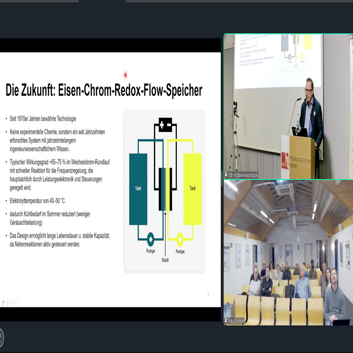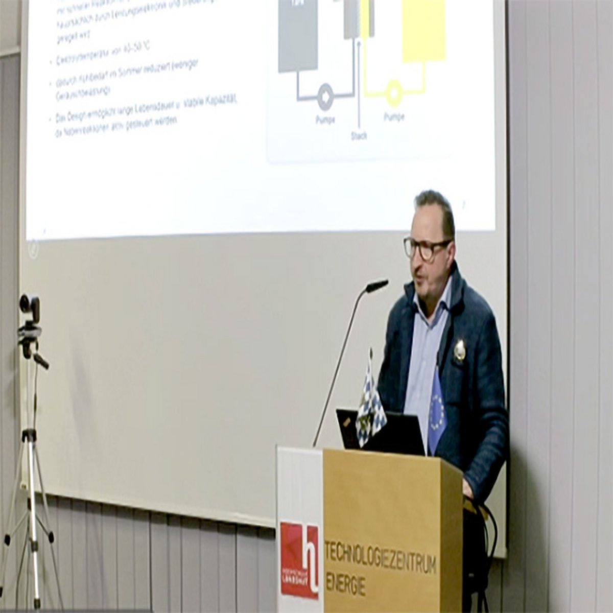 Der online zugeschaltete Vizepräsident der Hochschule Landshut, Prof. Dr. Marcus Jautze, begrüßte die rund 150 Teilnehmerinnen und Teilnehmer, die entweder den Weg ans Technologiezentrum Energie in Ruhstorf oder eine online-Teilnahme gewählt hatten. Das TZE, das sich mit Speichertechnologie befasse, sei für den Vortrag im Rahmen der Landshuter Energiegespräche, die in diesem Semester unter dem Leitthema „E-Power für die Energieende“ stehen, der optimale Austragungsort. Mit Redox Flow-Speichern werde eine spezielle Batterieform beleuchtet, in die das Jenaer Unternehmen viel Entwicklungsarbeit gesteckt habe, wie Prof. Dr. Christin Toigo, wissenschaftliche Leiterin des TZE, ergänzte.