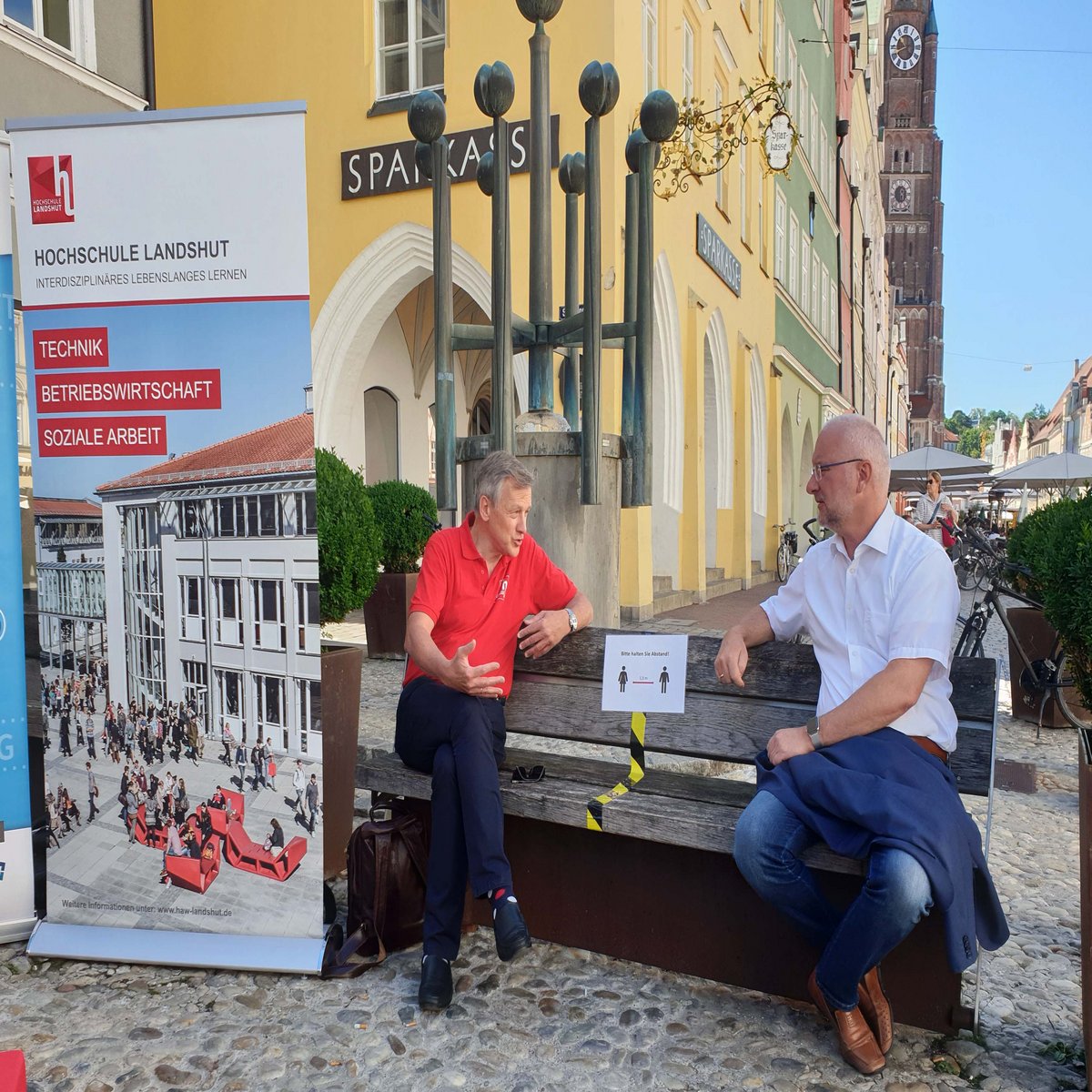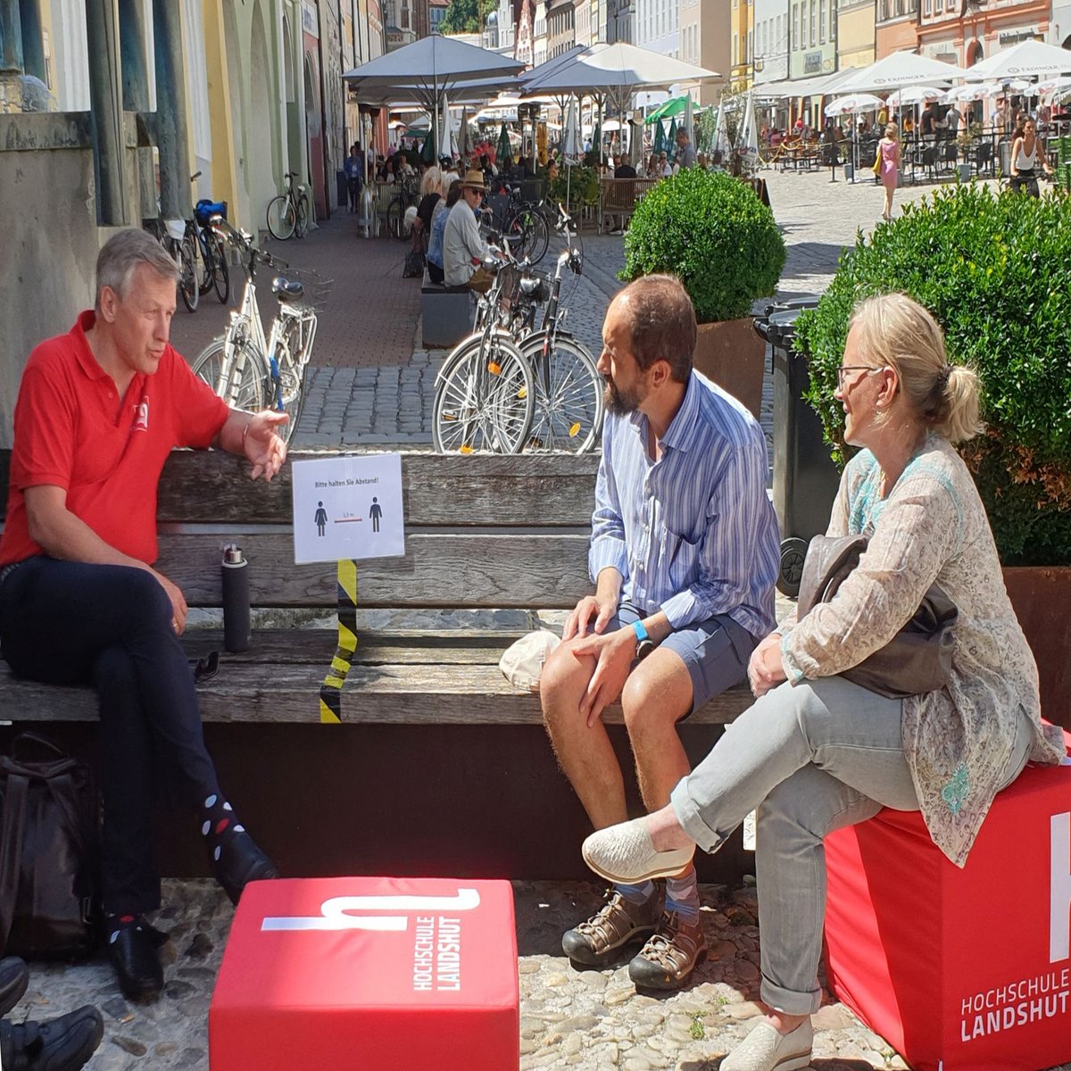 Wie schaffen wir den Wandel hin zu mehr erneuerbaren Energien? Was hat es mit intelligenten Netzen auf sich? Und warum gibt es noch so wenige Elektroautos? Diesen und vielen weiteren Fragen stellte sich Prof. Dr. Josef Hofmann von der Hochschule Landshut am vergangenen Dienstag mitten in der Landshuter Innenstadt. Der Leiter des Forschungsschwerpunkts Energie setzte sich auf eine Bank neben dem Rathaus – wer wollte, konnte sich dazusetzen und mit dem Experten über das Thema Energiewende plaudern. Bei den Landshuter Bürgerinnen und Bürgern kam die außergewöhnliche Aktion sehr gut an. Viele Passantinnen und Passanten nahmen sich die Zeit und tauschten sich mit dem Professor aus. Auch Oberbürgermeister Alexander Putz besuchte die Wissenschaftsbank und beteiligte sich am Gespräch. Hofmann ist mit der Resonanz hoch zufrieden: „Der direkte Austausch zwischen Wissenschaft und Gesellschaft ist enorm wichtig, vor allem bei gesellschaftsrelevanten Themen wie der Energiewende. Es ergaben sich dabei sehr gute Diskussionen.“ Die Aktion war Teil der hochschulübergreifenden Veranstaltung „Science Bench“, die der