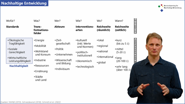 Der Abschnitt „Dimensionen nachhaltiger Entwicklung“ wurde von Prof. Dr. Markus Schmitt entwickelt. Konzeptionelle Grundlage hierfür war die sogenannte NE-Matrix, ein Modell, das zentrale Dimensionen nachhaltiger Entwicklung systematisch miteinander verknüpft und auch konzeptionelle Grundlage des Masterstudiengangs „Nachhaltigkeit und Transformation“ an der Hochschule Landshut ist.