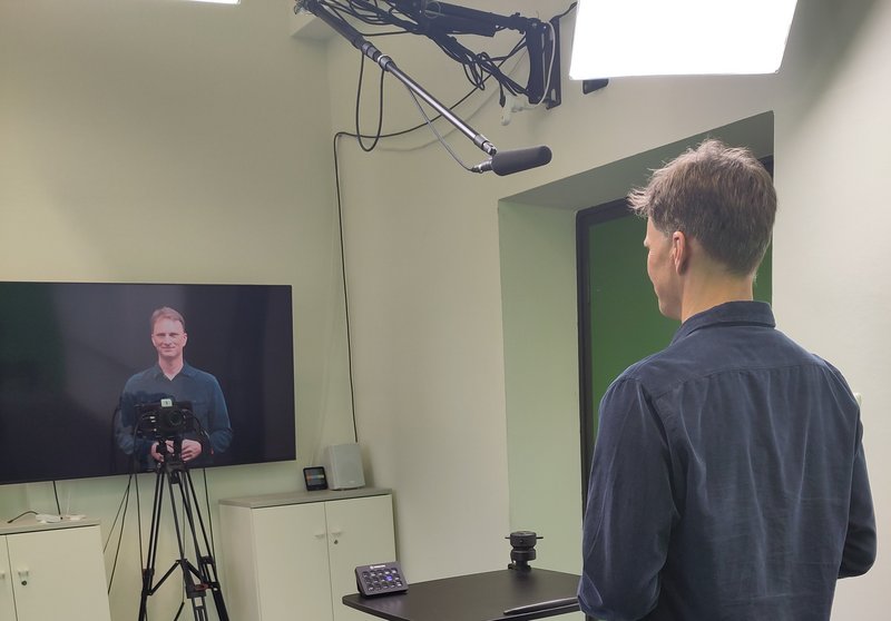 Bild 2: Prof. Dr. Markus Schmitt bei der Produktion der Lehrvideos im Medienlabor in München.