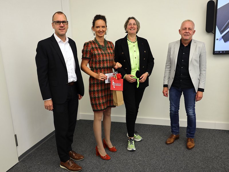 Bildunterschrift: Würdigten die Verdienste der scheidenden Vizepräsidentin Prof. Dr. Silvia Dollinger (2.v.l.): Vizepräsident für Digitalisierung, Gründung und Weiterbildung Prof. Dr.-Ing. Marcus Jautze (links), Hochschulpräsidentin Prof. Dr. Michaela Wirtz (3. v. l.) und Kanzler Dr. Johann Rist (rechts)