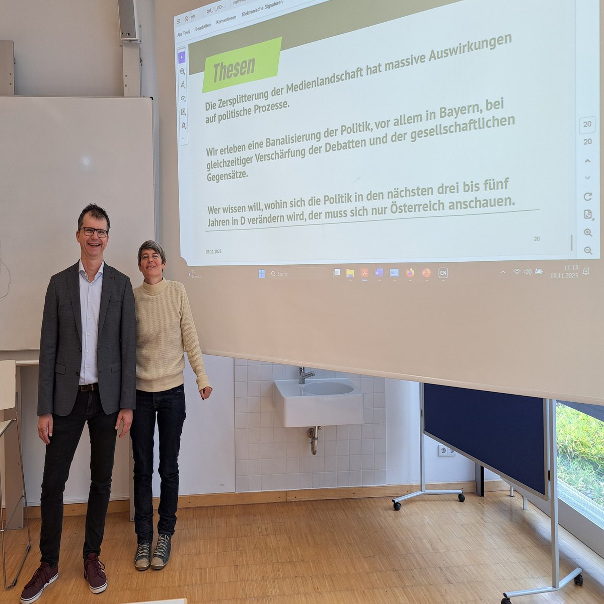 Bildunterschrift: Marc Decker (bis 2025 Geschäftsführer Bündnis 90/Die Grünen Bayern) und Prof. Dr. Bettina Leibetseder (Modulverantwortliche)