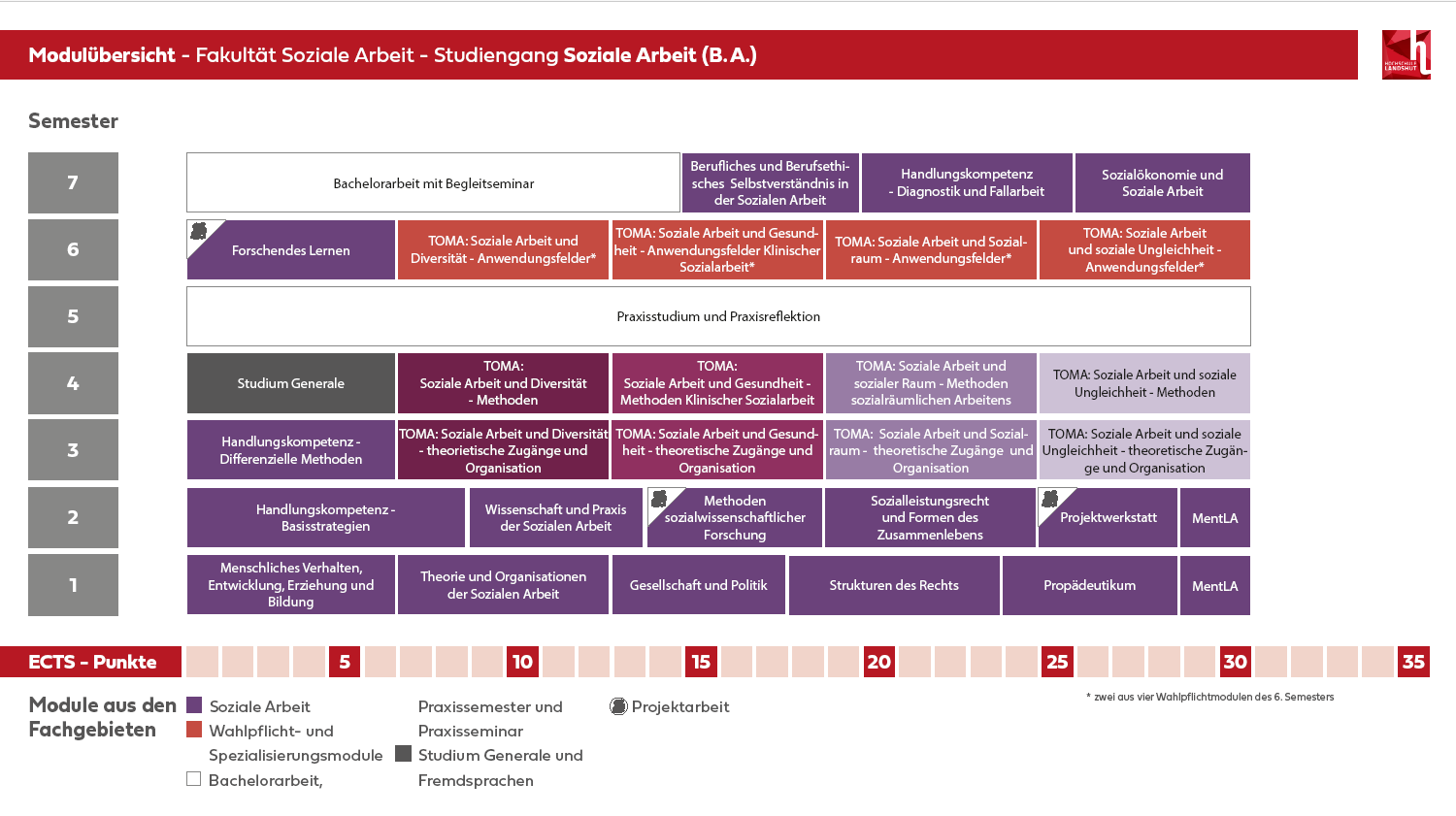 The concept of the degree programme provides for the TOMA module structure in the third, fourth and sixth semesters. Theoretical, organisational and methodological knowledge- as constitutive forms of knowledge in social work - are systematically transferred into action and application knowledge.