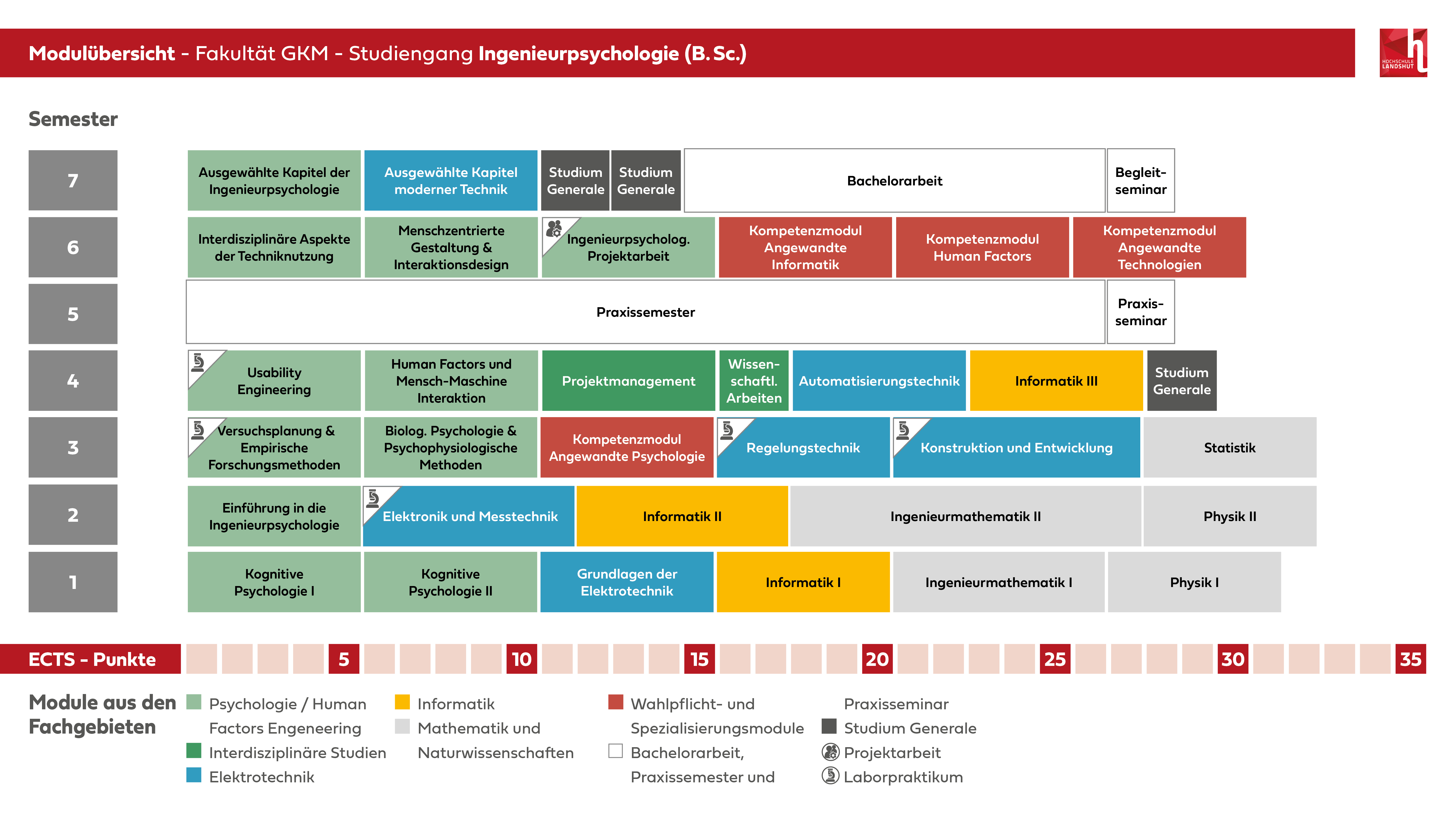Der Studiengang Ingenieurpsychologie besteht aus sechs theoretischen und einem praktischen Studiensemester. Das Studium umfasst dabei fünf Themenblöcke.