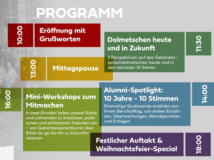 Fünf kurze Inputs aus unterschiedlichen Blickwinkeln eröffnen den Jubiläumstag: Studierende, Lehrende, Alumni und Gäste blicken gemeinsam auf das Gebärdensprachdolmetschen von heute und morgen.