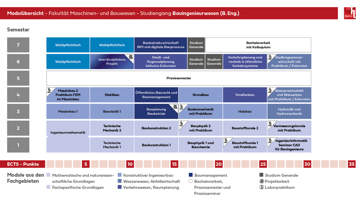 Im Bachelorstudiengang Bauingenieurwesen erlernen Sie die fachlichen Grundlagen und Kompetenzen für Entwurf, Planung, Konstruktion, Bau und Betrieb von Bauwerken des Hochbaus, der Verkehrsinfrastruktur sowie des Tief- und Wasserbaus. Es werden die Fertigkeiten und Kenntnisse vermittelt um im späteren Berufsleben die bauliche Umwelt sicher und wirtschaftlich aber auch nachhaltig und ressourcenschonend gestalten zu können. Neben klassischen Verfahren werden digitale Methoden behandelt, die auch im Bauingenieurwesen zunehmend an Bedeutung gewinnen.