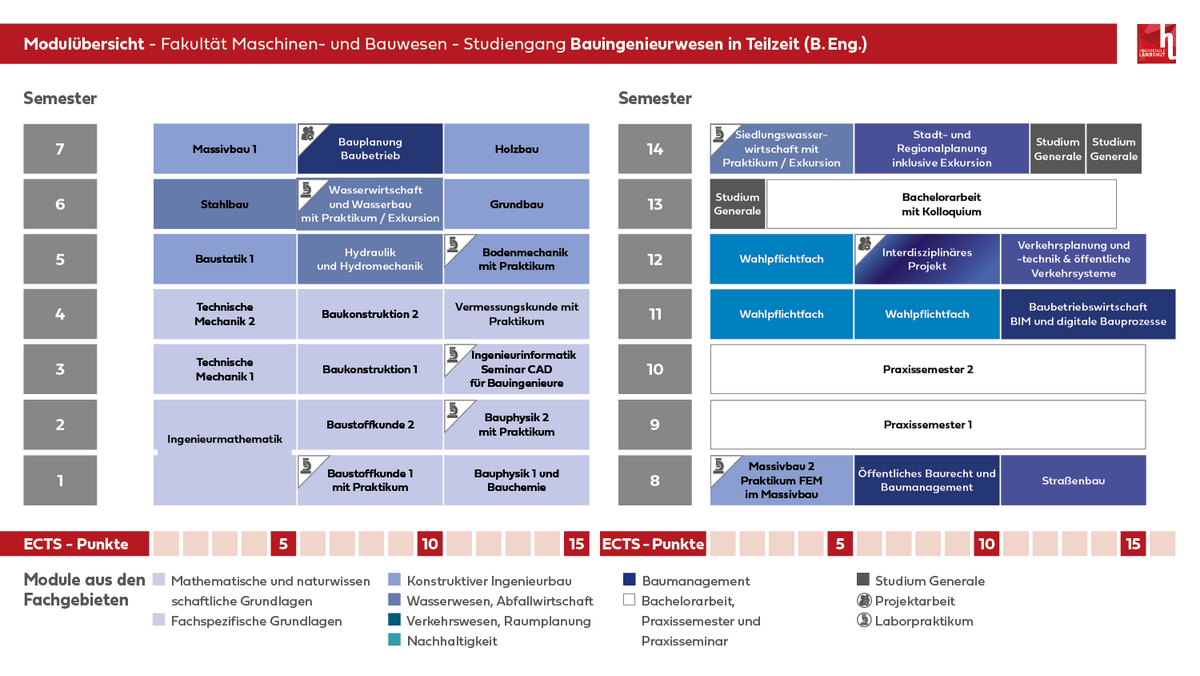 In Teilzeit verdoppelt sich die Semesteranzahl und schafft so die Freiräume für die Vereinbarkeit von Studium, Familie und Beruf. Unterstützt wird dies darüber hinaus durch die Möglichkeit einer Kinderbetreuung im CampusNest. Unser Ziel ist es, einen anspruchsvollen, aber gut durchdachten Bauingenieur-Studiengang anzubieten, der die Studierbarkeit betont.
