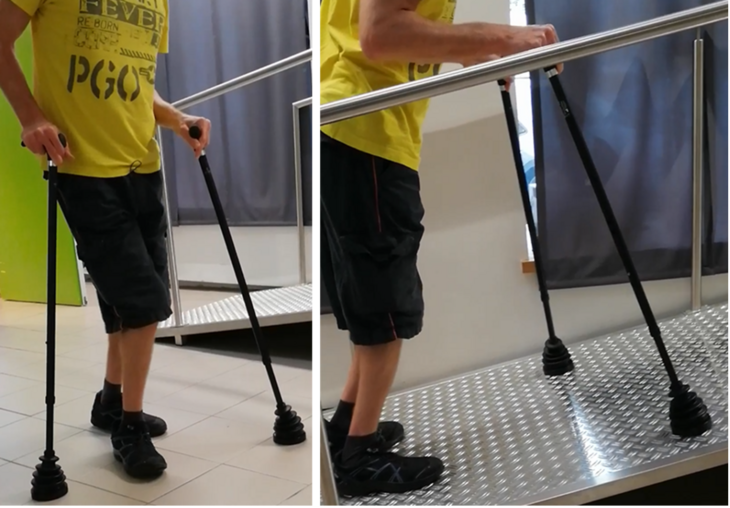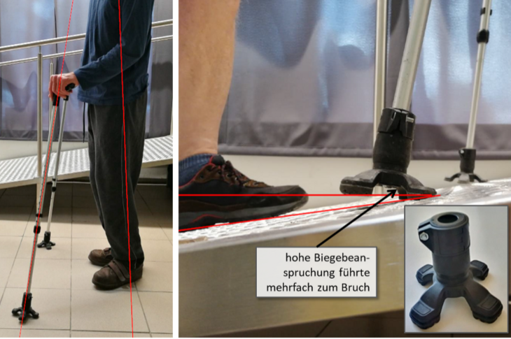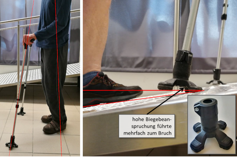 Ein 35-jähriger Patient mit spastischer Tetraparese ist lebenslang auf Gehstützen angewiesen (Abb. 1). Sein Lebensmittelpunkt liegt im ländlichen Raum, wo er täglich mit unebenem, nassem und rutschigem Gelände konfrontiert ist. Bisher verwendete der Patient handelsübliche Endstücke mit vier gummierten Füßen, die für Outdoor-Aktivitäten entwickelt wurden. In der Praxis erwies sich diese Lösung jedoch als ungeeignet: