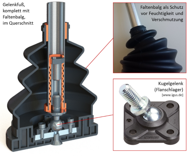 Zur Lösung der Probleme wurde an der Hochschule Landshut ein Endstück entwickelt, das auf einem kommerziell verfügbaren Kugelgelenk (Flanschlager) basiert (Abb. 2). Das Flanschlager wird mit einer Bodenplatte verschraubt. Dadurch lassen sich unterschiedliche Platten bzgl. Farbe, Material, Geometrie, Elastizität oder Profilierung verwenden.
