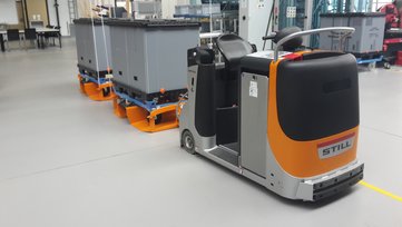 Die Routenzüge der Firmen STILL & LR Intralogistik sind für den Transport aller Materialen zwischen den Fabrikbereichen zuständig. Mit verschiedenen Anhängern ist der Transport von Klein- und Großladungsträgern möglich.