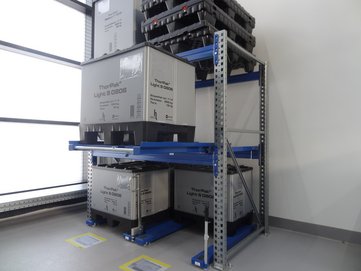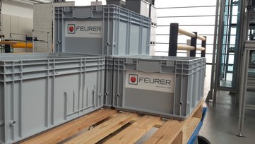 Trotz geringem Gewichts sind die KLT- Behälter der Firma Feurer enorm druck- und stoßbelastbar. In der Musterfabrik werden diese in Verbindung der Servus Anlage kombiniert.