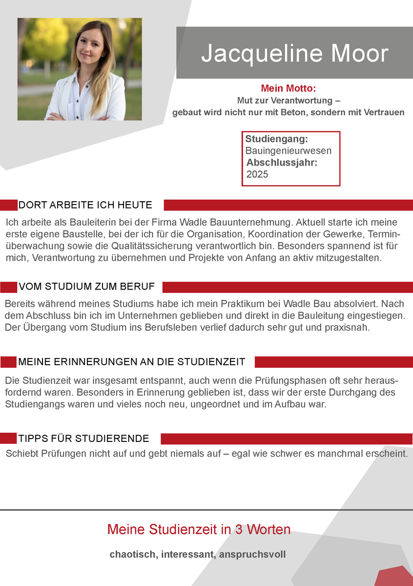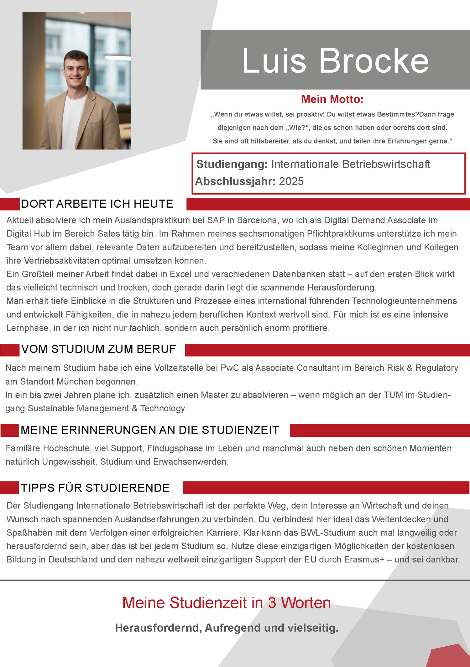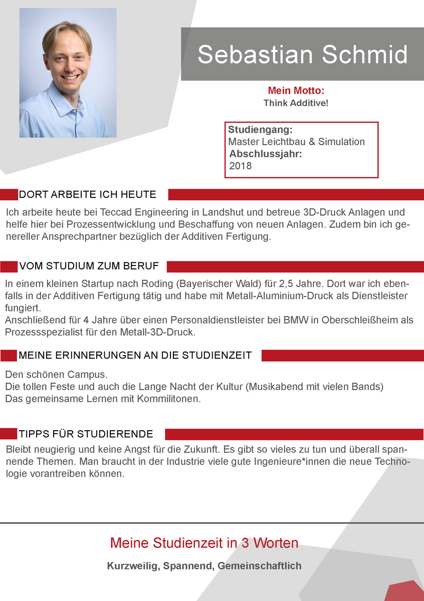 Unsere Alumni berichten daher in ihren Steckbriefen von ihren eigenen Erfahrungen zur Studienzeit an der Hochschule Landshut und dem Weg in das Berufsleben.