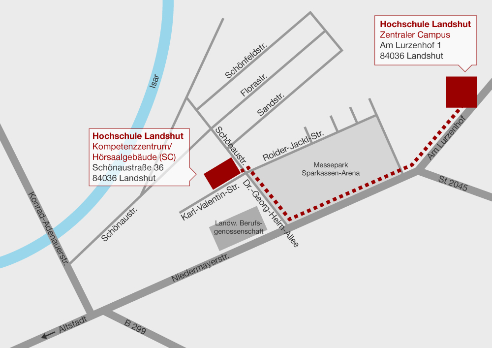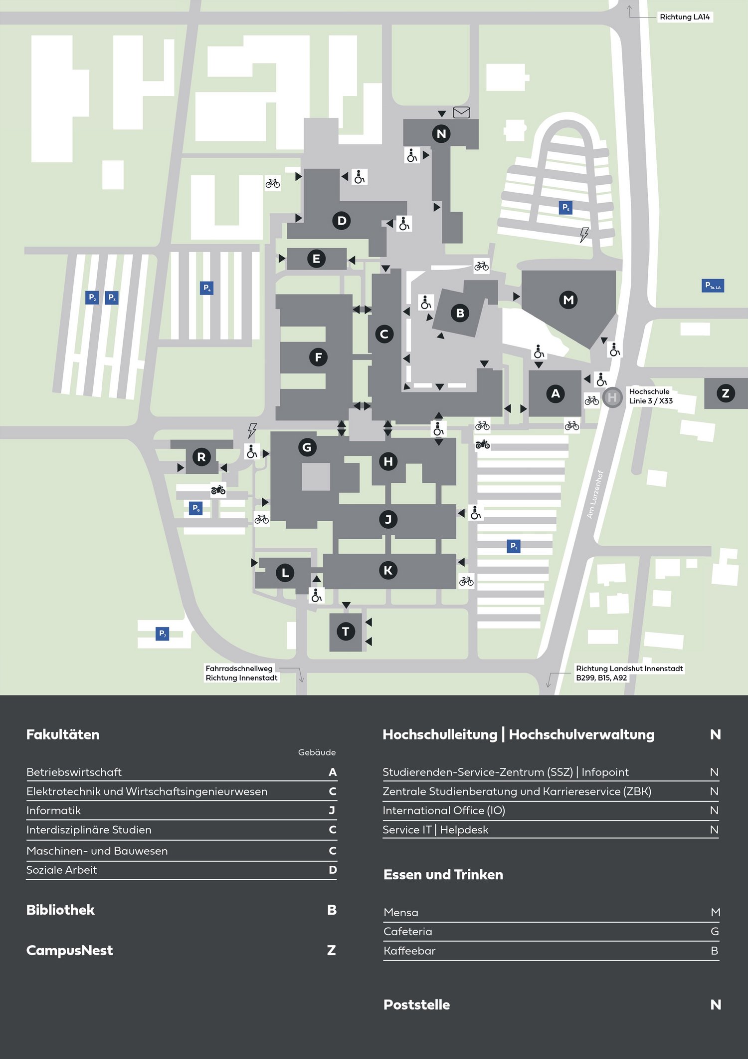 Alle Anschriften sowie Anfahrtsmöglichkeiten zu den verschiedenen Standorten der Hochschule Landshut.