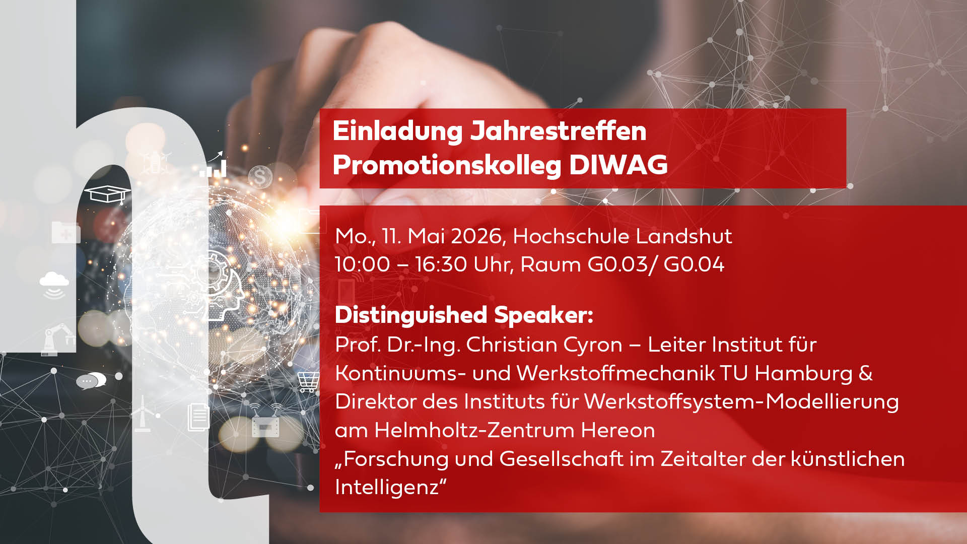 | 10:50 – 11:20 | Distinguished Speaker: Prof. Dr.-Ing. Christian Cyron - Leiter Institut für Kontinuums- und Werkstoffmechanik TU Hamburg & Direktor des Instituts für Werkstoffsystem-Modellierung am Helmholtz-Zentrum Hereon, AI-Ambassador der Helmholtz-Gemeinschaft "Forschung und Gesellschaft im Zeitalter der künstlichen Intelligenz" |